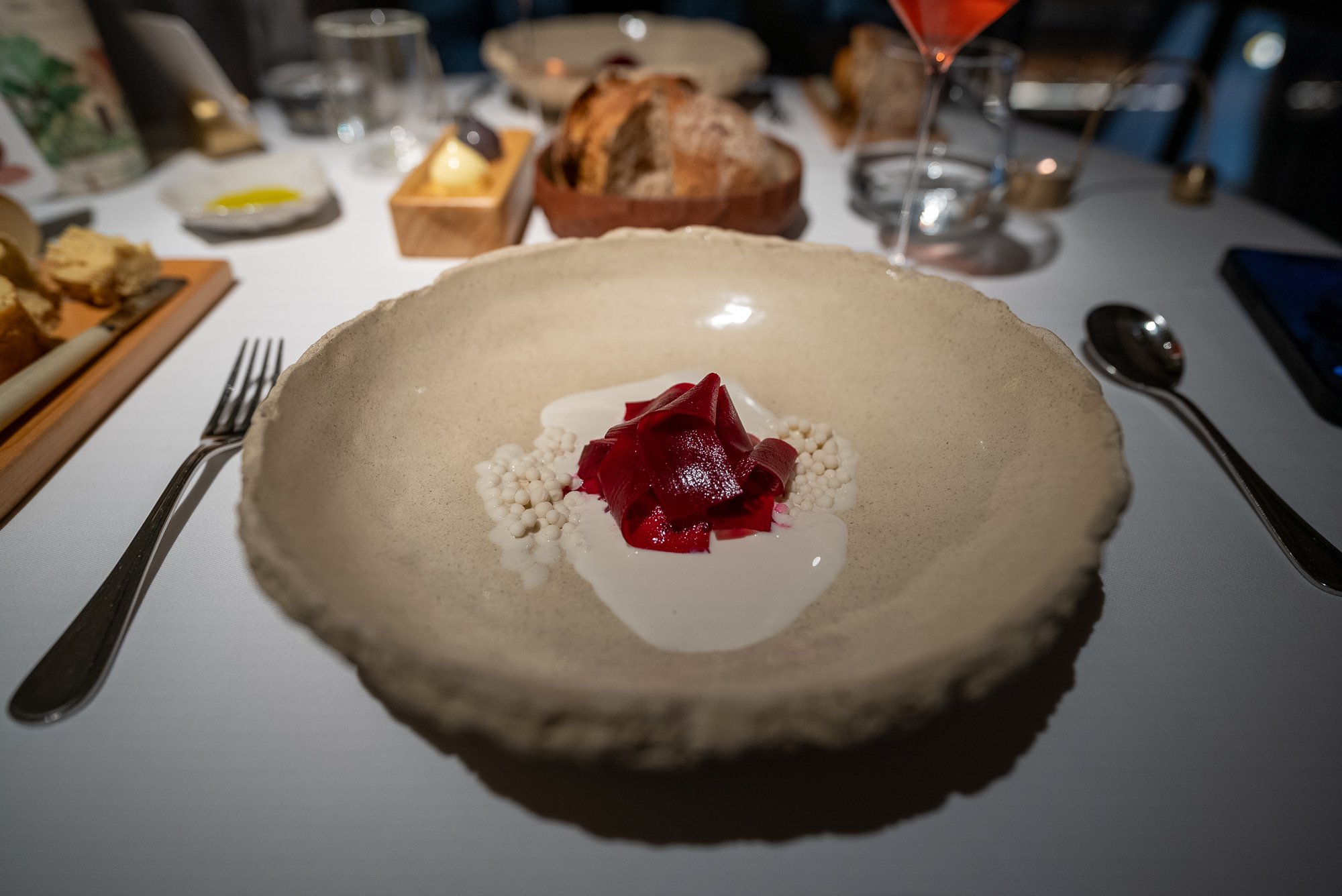 Beetroot - Varying textures of beet, pine nut milk, mustard seeds