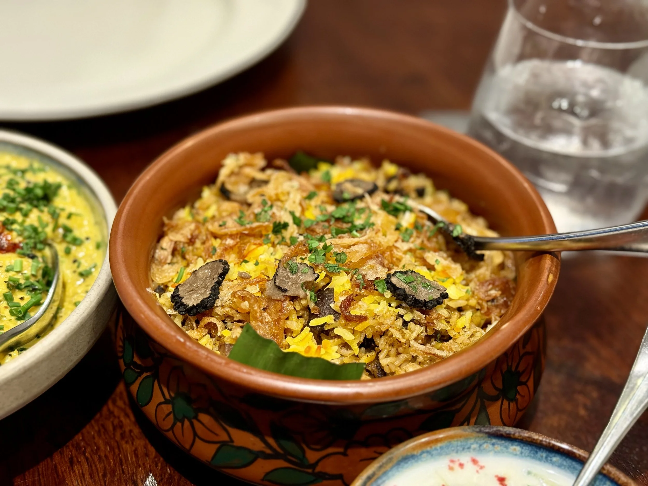 Wild mushroom and morel kaima biryani - Kaima rice, sliced truffle, pink peppercorn raita